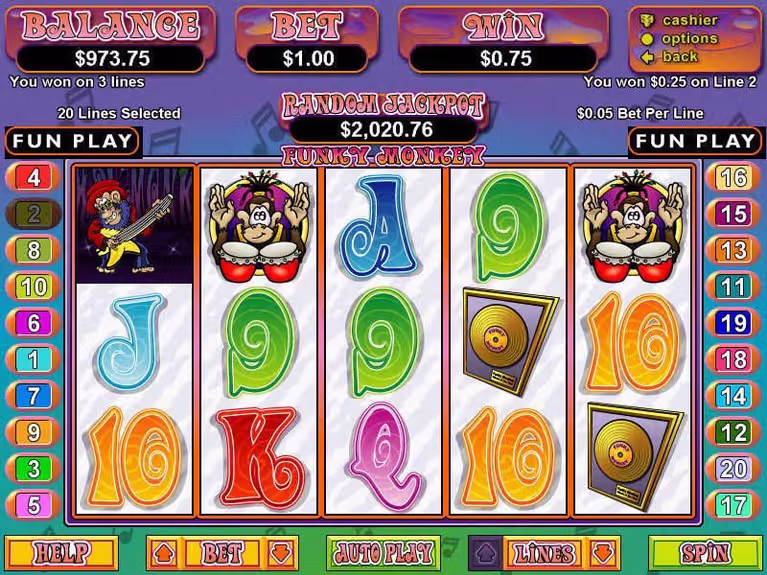 Funky Monkey has variable wager lines that you can turn on and off. There are 20 lines overall and you can adjust the amount that you wager on each line. The line wagers can be set to a minimum of $0.01 and a maximum of $5.00. When you play Funky Monkey you are free to wager between $0.20 and $100.00 depending on what you are comfortable with, so choose with care and make the most of the options that you like the best overall.A So So Top Prize
